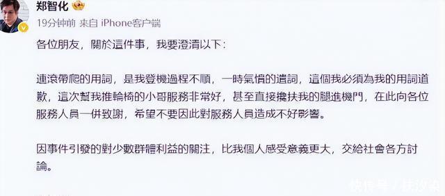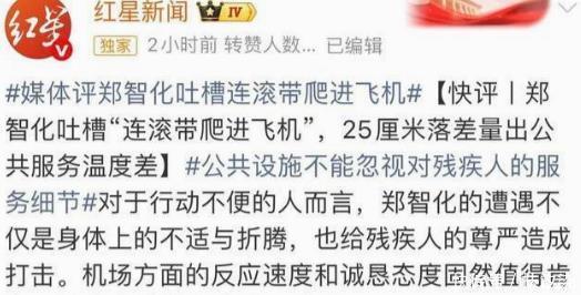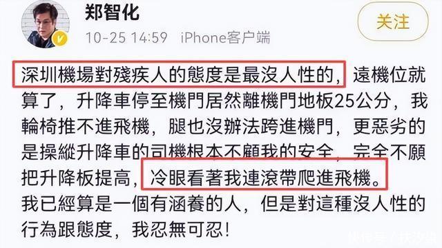 10月25日,郑智化发布长文,大力控告深圳机场。 指出登记车与机舱门高达25公分, 导致自己很难移动轮椅,正常行驶。